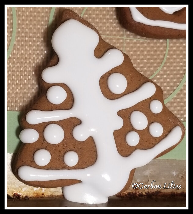 [Lana] A couple hours later, having now freehand-cut and baked our gingerbread as well as mixed up some royal icing (I should mention at this point that I do watch some baking shows… not that I actually retain any techniques or knowledge beyond some sparse bits of terminology), we decorated our masterpieces. We waited impatiently for them to set. Well, I was impatient… John acted like it was just any other day and not like these were about to be the bestest cookies ever. Wow! They were delicious.